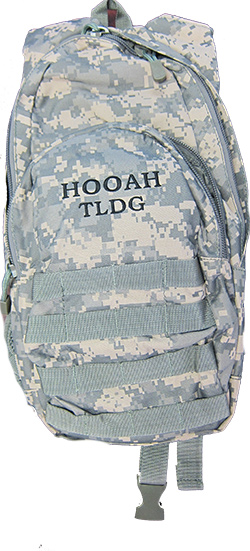 TLDG Hydration Backpack in digital Army combat print, embroidered with “Hooah!” and “TLDG” on the front pocket. One main. large compartment. Hydration pocket with Velcro closure and carrying handle. Complete 2.5 liter bladder. Modular attachment points on front face. Expandable design and stay-cool mesh backing. Fully adjustable shoulder straps. Heavy duty zippers and hardware.